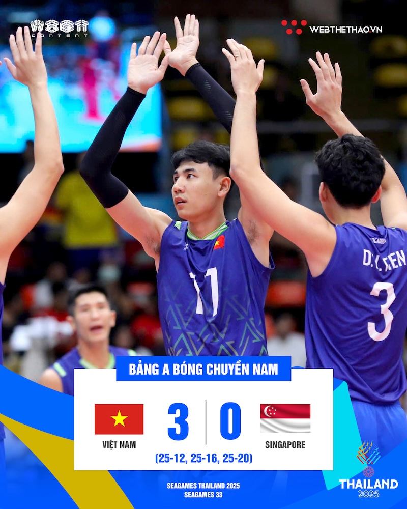 Đội tuyển bóng chuyền nam Việt Nam tiếp tục thể hiện phong độ ấn tượng tại SEA Games 33 khi giành chiến thắng thuyết phục 3-0 trước Singapore với các tỷ số 25-12, 25-16 và 25-20.