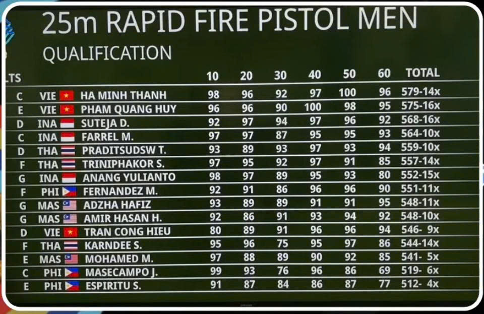 Kết quả phần thi này xác định đội tuyển giành HCV đồng đội và 6 VĐV xuất sắc nhất vào thi chung kết cá nhân. Trước đó, sáng qua sau loạt bắn 30 viên đầu tiên Minh Thành dẫn đầu với 286 điểm, còn Quang Huy xếp thứ 4 với 282 điểm. Đáng nói, do gặp sự cố ở khẩu súng sử dụng, Công Hiếu chỉ đạt điểm số khiêm tốn 260 và đứng thứ 15 cuối cùng.