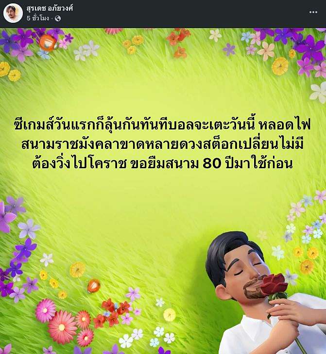 "Sự phấn khích đang dâng cao ngay lúc này trong ngày đầu tiên của SEA Games 2025. Trận đấu dự kiến diễn ra hôm nay (3-12), và một số đèn tại Sân vận động Rajamangala đã bị hỏng. Chúng ta không có đèn thay thế trong kho. Chúng ta buộc phải đến Korat và mượn đèn ở sân vận động 80 năm tuổi này để mang về sử dụng", phóng viên của TNN viết trên Facebook.