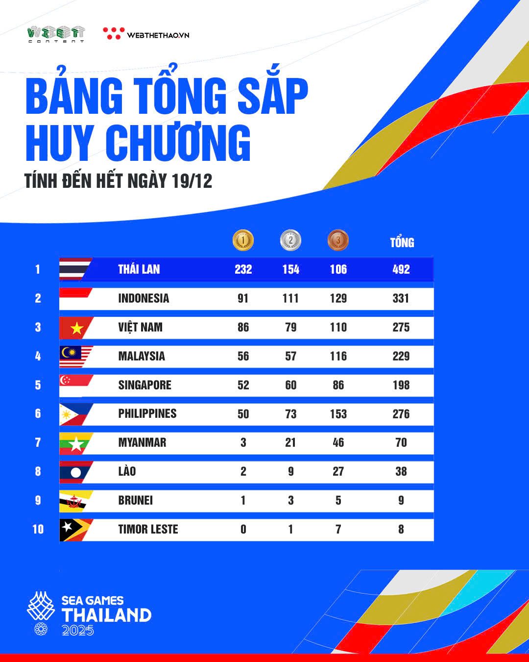 Chủ nhà Thái Lan tiếp tục khẳng định sức mạnh vượt trội khi vững vàng ở vị trí số 1 với 232 tấm HCV. Dù không hoàn thành chỉ tiêu đề ra ban đầu là từ 240 HCV trở lên, Thái Lan vẫn tạo nên dấu mốc lịch sử khi lập kỷ lục số huy chương Vàng nhiều nhất trong lịch sử SEA Games. Sự áp đảo toàn diện ở hàng loạt môn thế mạnh, cùng lợi thế sân nhà, giúp đoàn Thái Lan duy trì khoảng cách rất lớn với các đối thủ bám đuổi.