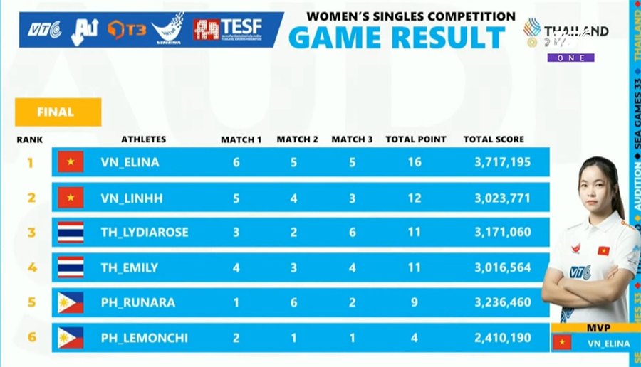 ĐT Audition Việt Nam giành HCV và HCB đơn nữ. Lê Thị Hoài Phương "Elina" tạo ra sự vượt trội hoàn toàn trong vòng chung kết nội dung đơn nữ Esports môn Audition - nội dung đơn nữ để giành về tấm HCV cho Đoàn TTVN tại SEA Games 33. Tô Ý Linh cũng xuất sắc giành HCB.