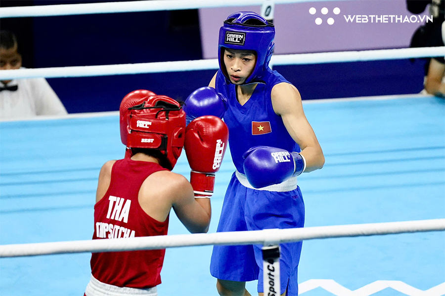 Ngô Ngọc Linh Chi (giáp xanh) thua điểm không đồng thuận võ sĩ Thái Lan Yodwaree Thipsatcha, giành HCB boxing hạng cân Light Fly (45-48kg).