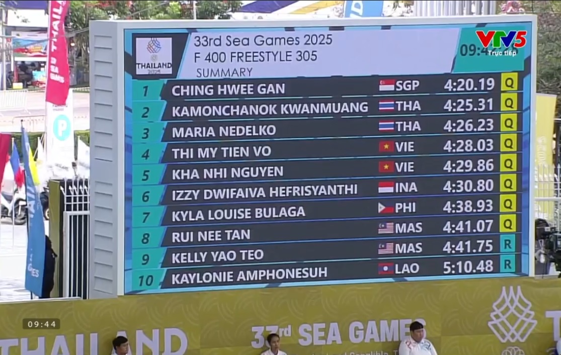 Ở nội dung vòng loại 400m tự do nữ, Võ Thị Mỹ Tiên và Nguyễn Khả Nhi lần lượt về nhất và nhì lượt bơi đầu tiên. Cả hai đều giành quyền vào thi chung kết khi đứng thứ tư và năm chung cuộc.