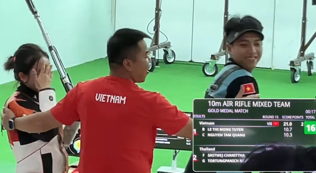 Bắn súng: Đội tuyển Việt Nam đoạt HCV 10m súng trường hơi hỗn hợp sau khi đánh bại đôi VĐV chủ nhà Thái Lan 16-14 trong trận chung kết.