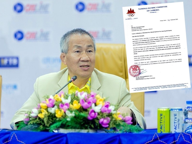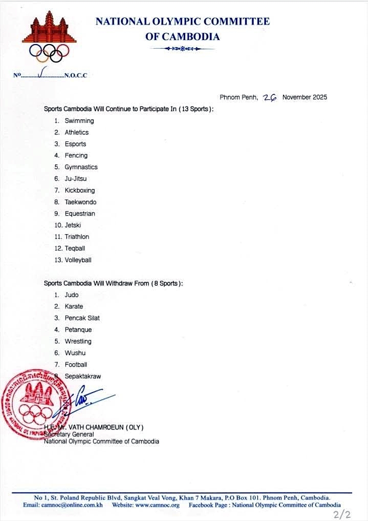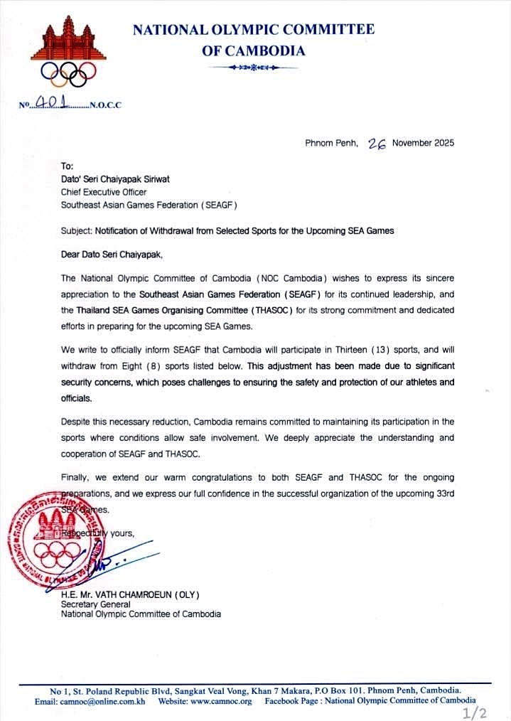 Văn bản được cho là "chính thức", có đóng dấu đỏ của Uỷ ban Olympic Campuchia (NOCC) cũng như có chữ ký của tổng thư ký, ông Vath Chamroeun, về việc quốc gia này rút lui khỏi gần một nửa số môn đăng ký thi đấu tại SEA Games 2025 vừa được hé lộ.