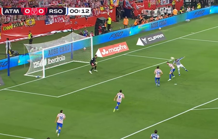 Trận chung kết Cúp Nhà vua tại sân La Cartuja (Sevilla) đã bắt đầu theo cách khó tin nhất đối với thầy trò Diego Simeone. Ngay sau tiếng còi khai cuộc của trọng tài Javier Alberoja Rojas, Real Sociedad thực hiện pha dàn xếp tấn công chớp nhoáng.