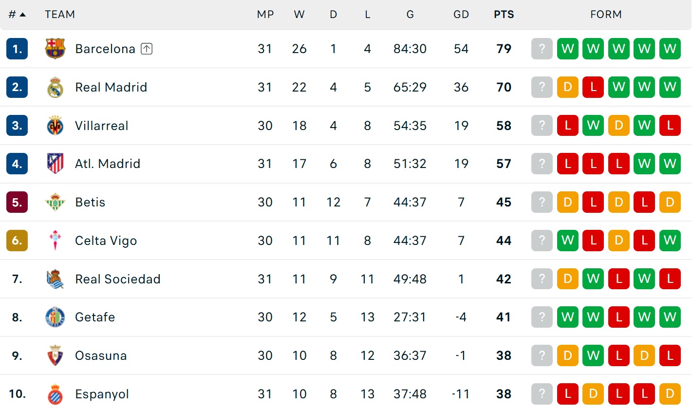 Bảng xếp hạng La Liga mới nhất