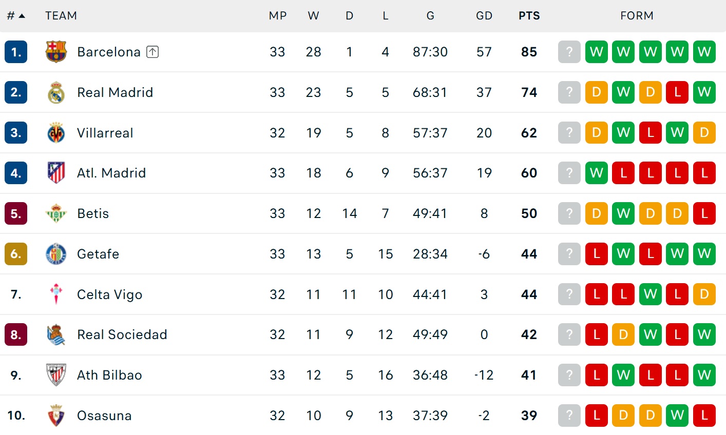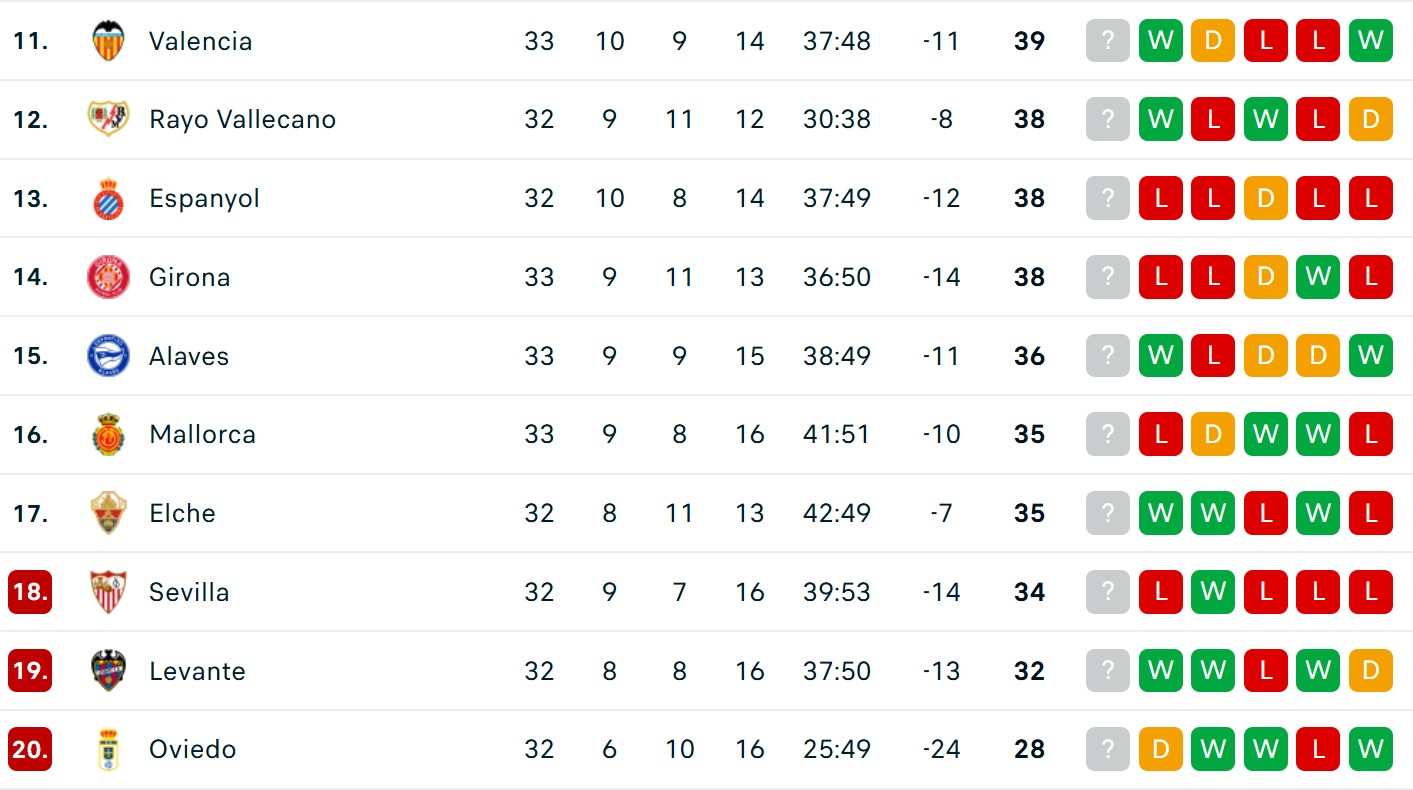 Bảng xếp hạng La Liga mới nhất