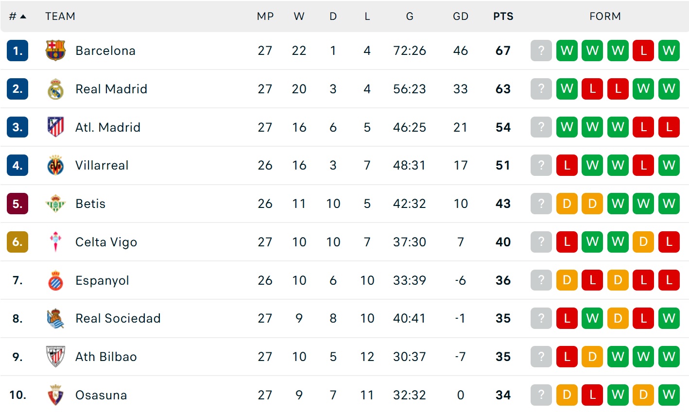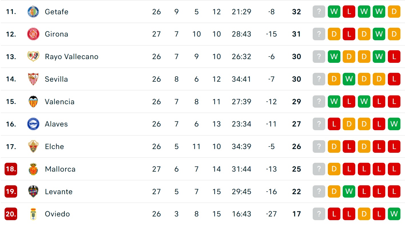 Bảng xếp hạng La Liga mới nhất