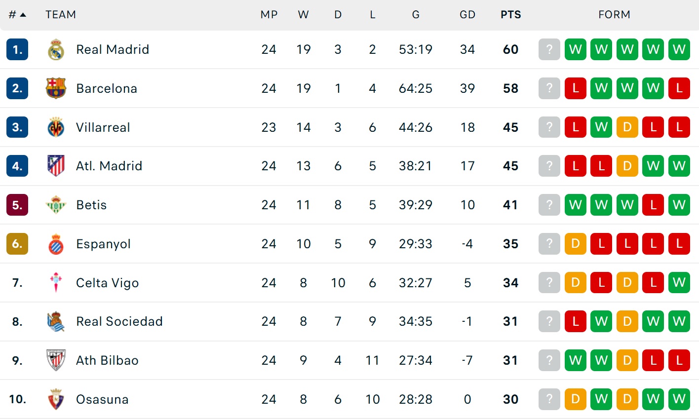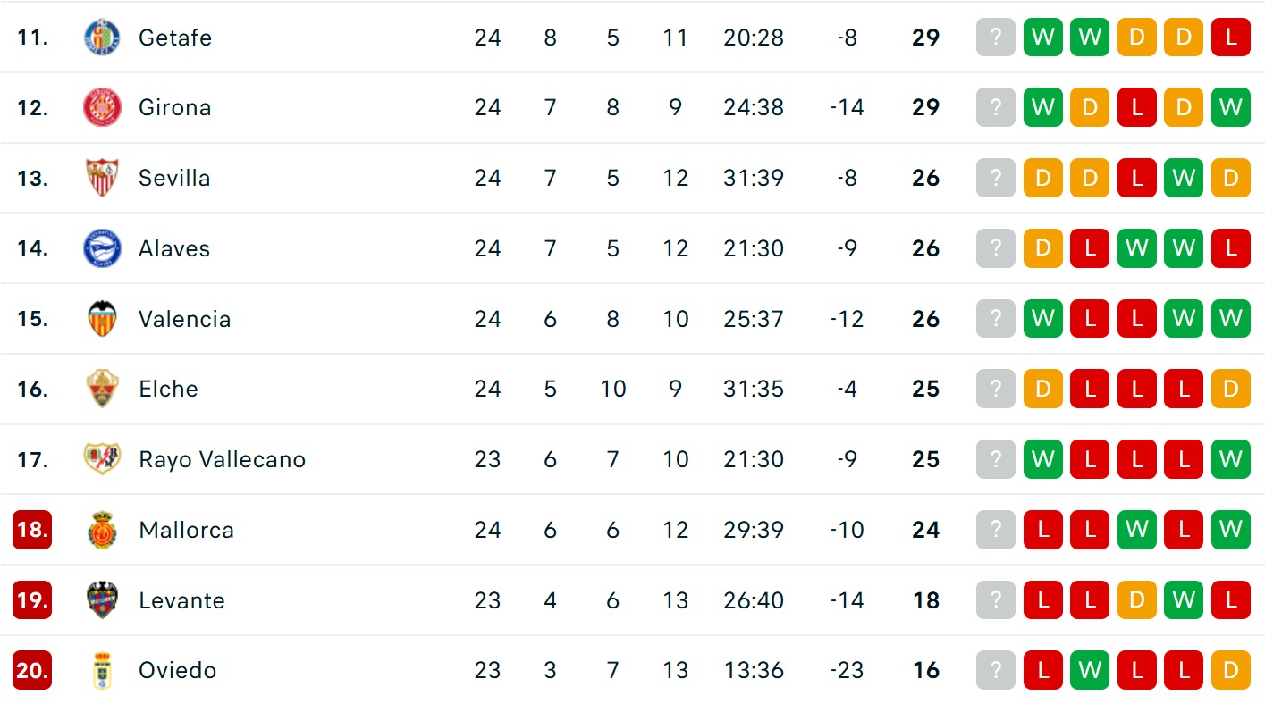 Bảng xếp hạng La Liga sau 25 vòng đấu đã có sự thay đổi sau khi chứng kiến Barcelona hứng chịu thất bại gây sốc trên sân Girona.