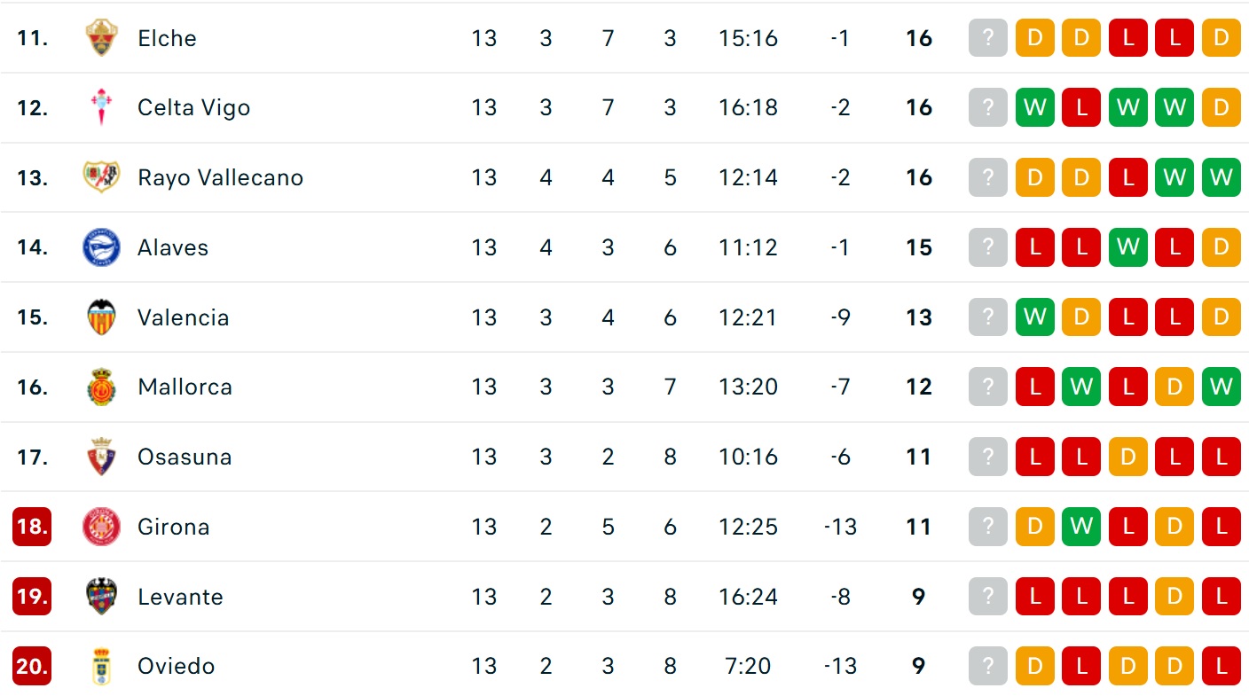 Real Madrid hai lần bị Elche vượt lên dẫn trước và phải nhờ đến các bàn gỡ của Huijsen và Bellingham trong hơn 10 phút cuối mới tránh khỏi thất bại. Kết quả hoà 2-2 này khiến thầy trò Xabi Alonso chỉ còn hơn Barcelona 1 điểm duy nhất trên bảng xếp hạng. Ngay cả những đối thủ phía sau như Villarreal, Atletico Madrid cũng rút ngắn khoảng cách sau khi Real Madrid mất điểm cả hai vòng gần nhất.