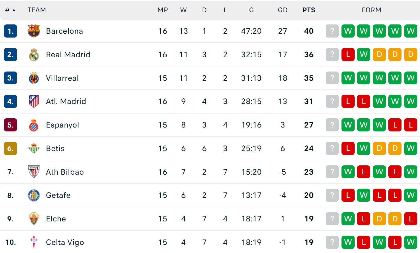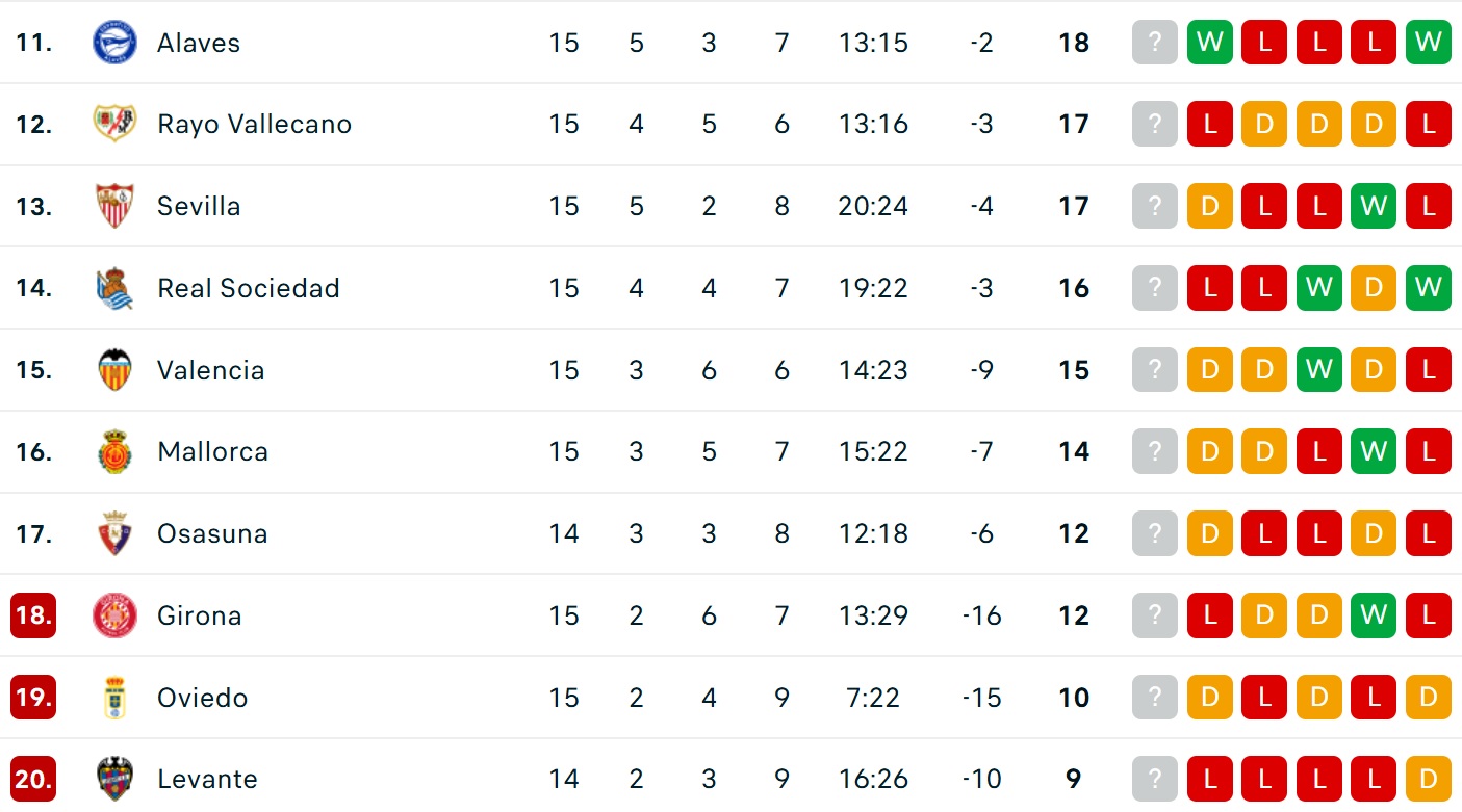 Bảng xếp hạng La Liga 2025/26
