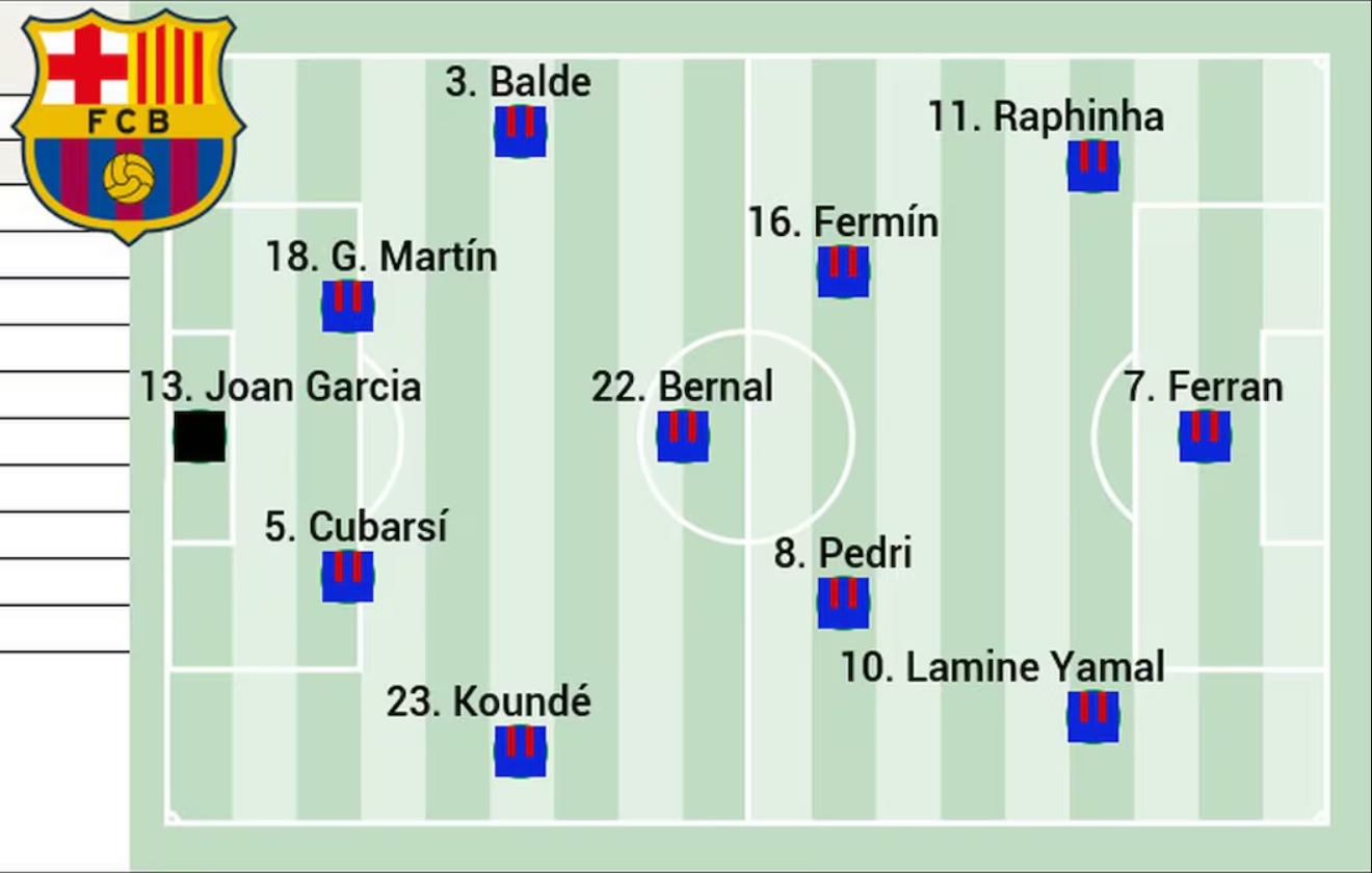 Barcelona: Joao Garcia; Kounde, Cubarsi; Martin, Balde; Pedri, Bernal, Fermin; Yamal, Ferran Torres, Raphinha.