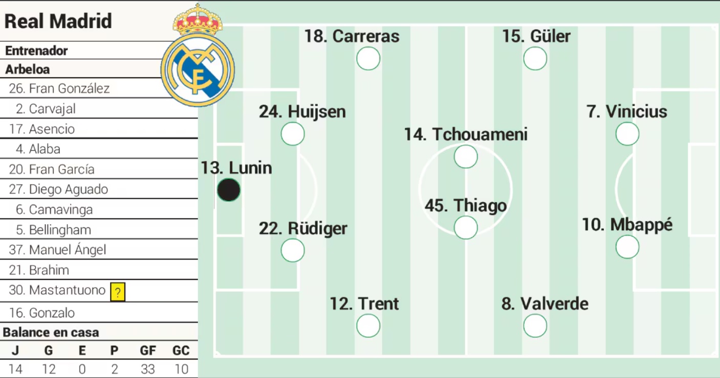 Real Madrid (4-4-2): Lunin; Trent, Rudiger, Huijsen, Carreras; Valverde, Thiago, Tchouameni, Guler; Mbappe, Vinicius.