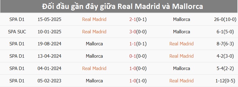 Tỷ lệ trận đấu: Real Madrid thắng 2/3 trận vừa qua theo tỷ số châu Á, chỉ thua 2/8 trận gần đây. Về phần mình, Mallorca không thắng 2 trận mới nhất, chỉ thắng 1/6 trận trước đó.