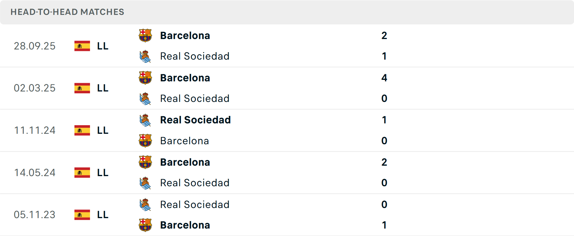 Tỷ lệ trận đấu: Real Sociedad thắng 3 và thua 4 trong 7 trận gần đây theo tỷ số châu Á. Về phần mình, Barcelona trải qua 5 trận thắng liên tiếp.