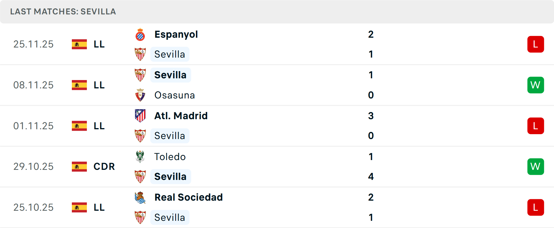 Ngược lại, Sevilla đang gặp khủng hoảng dưới thời HLV Matias Almeyda, chỉ thắng một trong 5 trận gần nhất. Đội chủ nhà thiếu sự cân bằng, với 19 bàn thắng và 21 bàn thua. Thành tích sân nhà của họ (2 thắng, 1 hòa, 3 thua) cũng không mang lại sự an tâm.