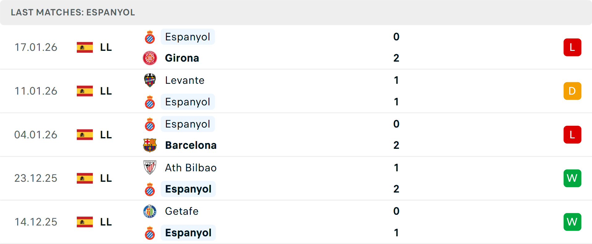 Phía bên kia, Espanyol dù đang bay cao ở vị trí thứ 5 với 34 điểm nhưng lại đang rơi vào một cuộc khủng hoảng nhỏ. Đội bóng xứ Catalonia chỉ giành được 1 điểm trong 3 trận gần nhất, bao gồm thất bại cay đắng 0-2 trước Girona.