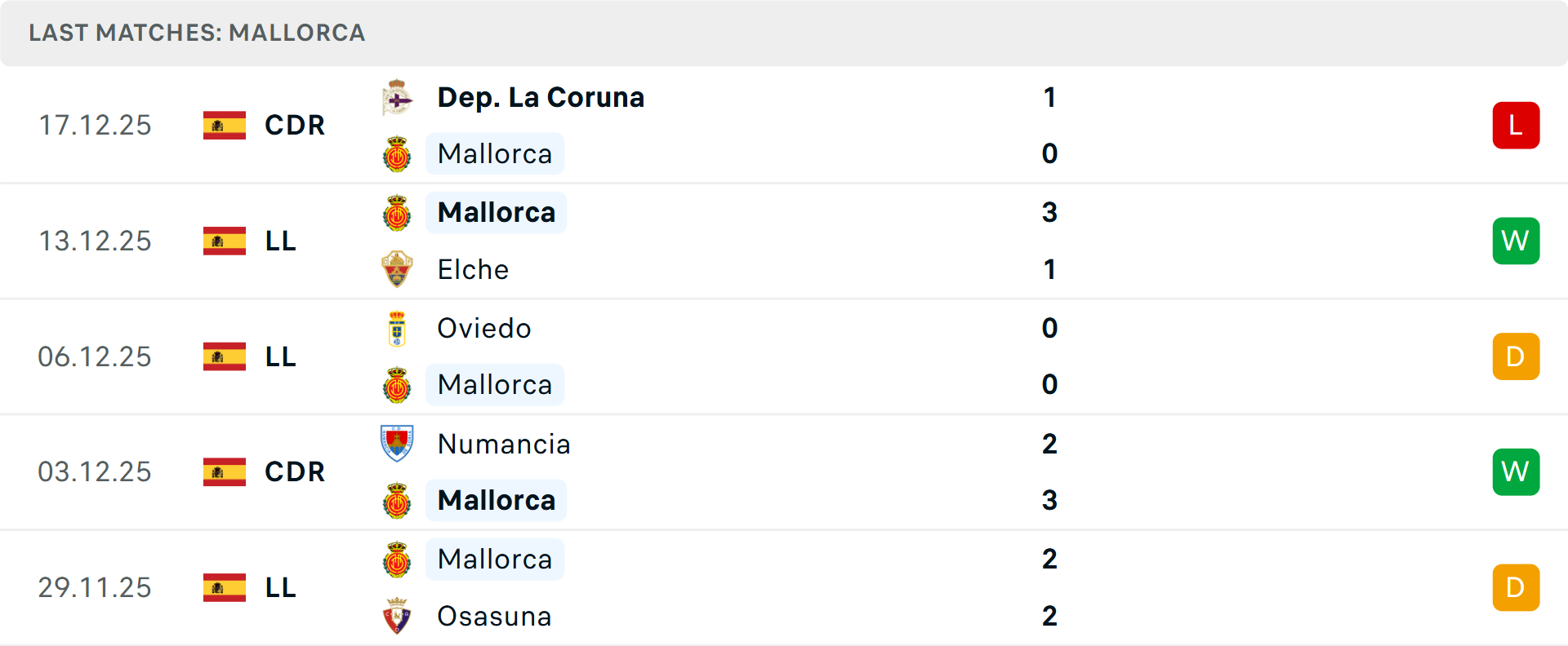 Phía bên kia chiến tuyến, Mallorca của HLV Jagoba Arrasate xếp thứ 14 nhưng cũng chỉ hơn đội chủ nhà 2 điểm. Dù đang có chuỗi 3 trận bất bại tại La Liga, "Cướp biển" lại thường xuyên "yếu bóng vía" khi xa nhà, chỉ giành được 4 điểm sau 8 trận khách mùa này. Với sự thận trọng của cả hai đội trong cuộc đua trụ hạng, một thế trận chặt chẽ và thiếu đột biến là kịch bản dễ xảy ra nhất.