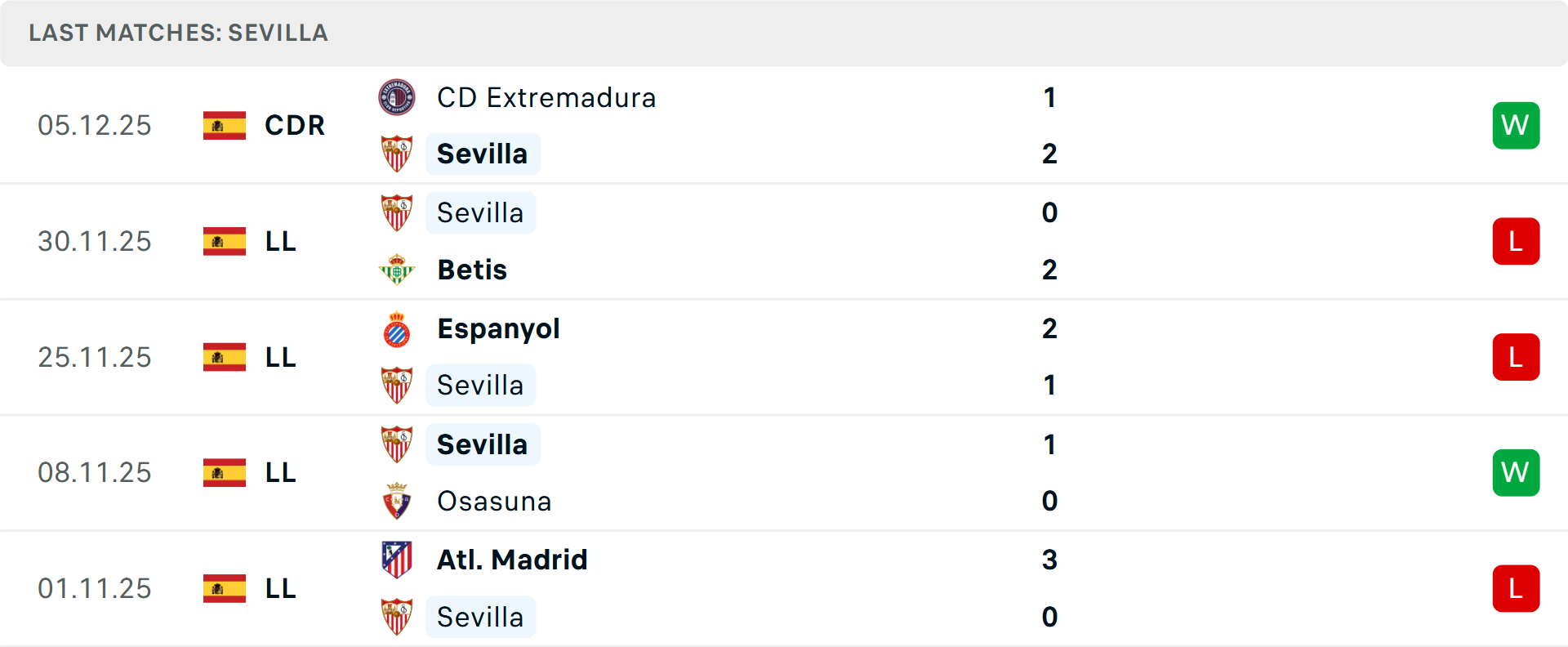 Sevilla (hạng 13) đang trải qua giai đoạn khó khăn với 3 thất bại trong 4 trận gần nhất tại La Liga, bao gồm trận thua đậm trong derby Seville. Hàng thủ là vấn đề lớn khi họ đã thủng lưới đến 23 bàn. Dù cũng vượt qua Cúp Nhà vua, phong độ sân khách của Sevilla (chỉ 9 điểm/7 trận) không hề thuyết phục.