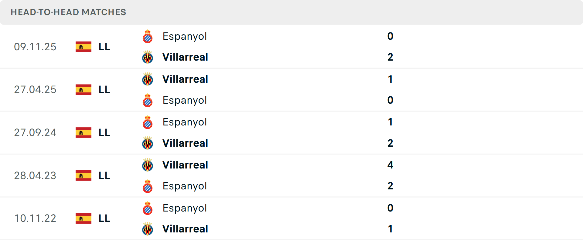 Tổng bàn thắng cả trận: Cả 2 trận vừa qua của Villarreal đều vượt mốc tổng bàn thắng, tương tự là 2 trận mới nhất của Espanyol, đội đều lọt lưới ít nhất 2 bàn ở 3 trận liên tiếp.