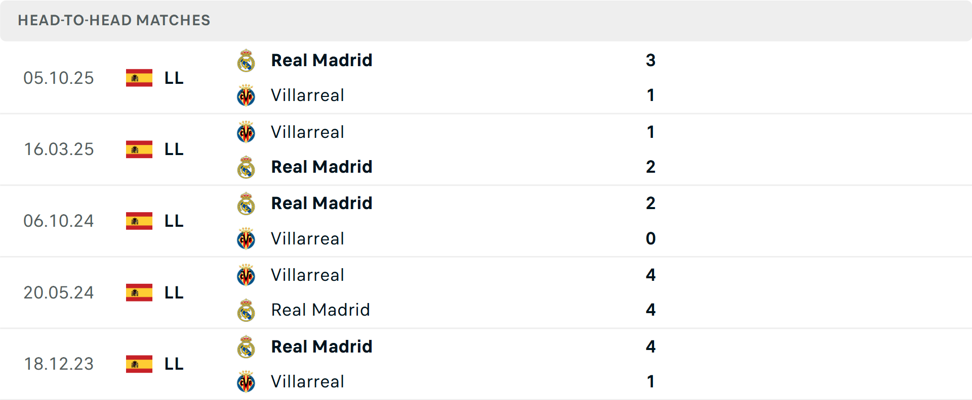Tổng bàn thắng cả trận: 6/8 cuộc đối đầu trước đó giữa hai đội vượt mốc tổng bàn thắng, tương tự là 4/7 trận gần đây của Villarreal và 7/9 trận của Real Madrid.