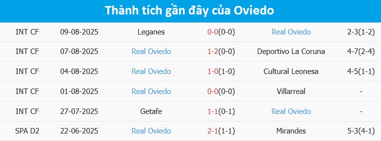 Tỷ lệ trận đấu: Villarreal thắng cả 2 trận chính thức mới nhất theo tỷ số châu Á. Về phần mình, Real Oviedo chỉ thắng 1/3 trận vừa qua.