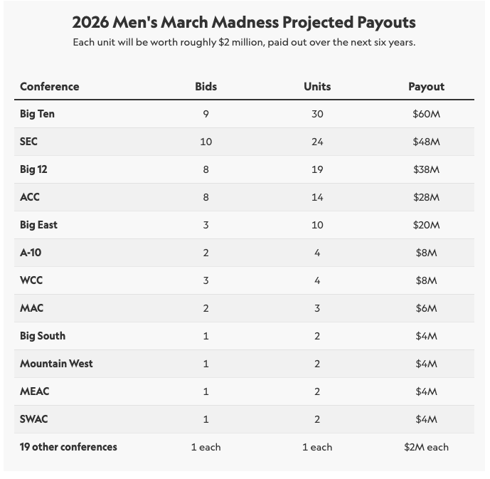 Ví dụ thực tế: Năm 2026, mỗi Unit được định giá khoảng gần 2.000.000 USD/6 năm (từ 2026 đến 2032). Nghĩa là chỉ cần lọt vào March Madness và thi đấu đúng 1 trận, đội bóng đã mang về cho liên đoàn của họ 333.000 USD/năm. Với các đội vào sâu, ví dụ đến bán kết (thi đấu 5 trận), họ đã mang về hơn 10 triệu USD cho liên đoàn khu vực để chia lại cho toàn bộ các trường.