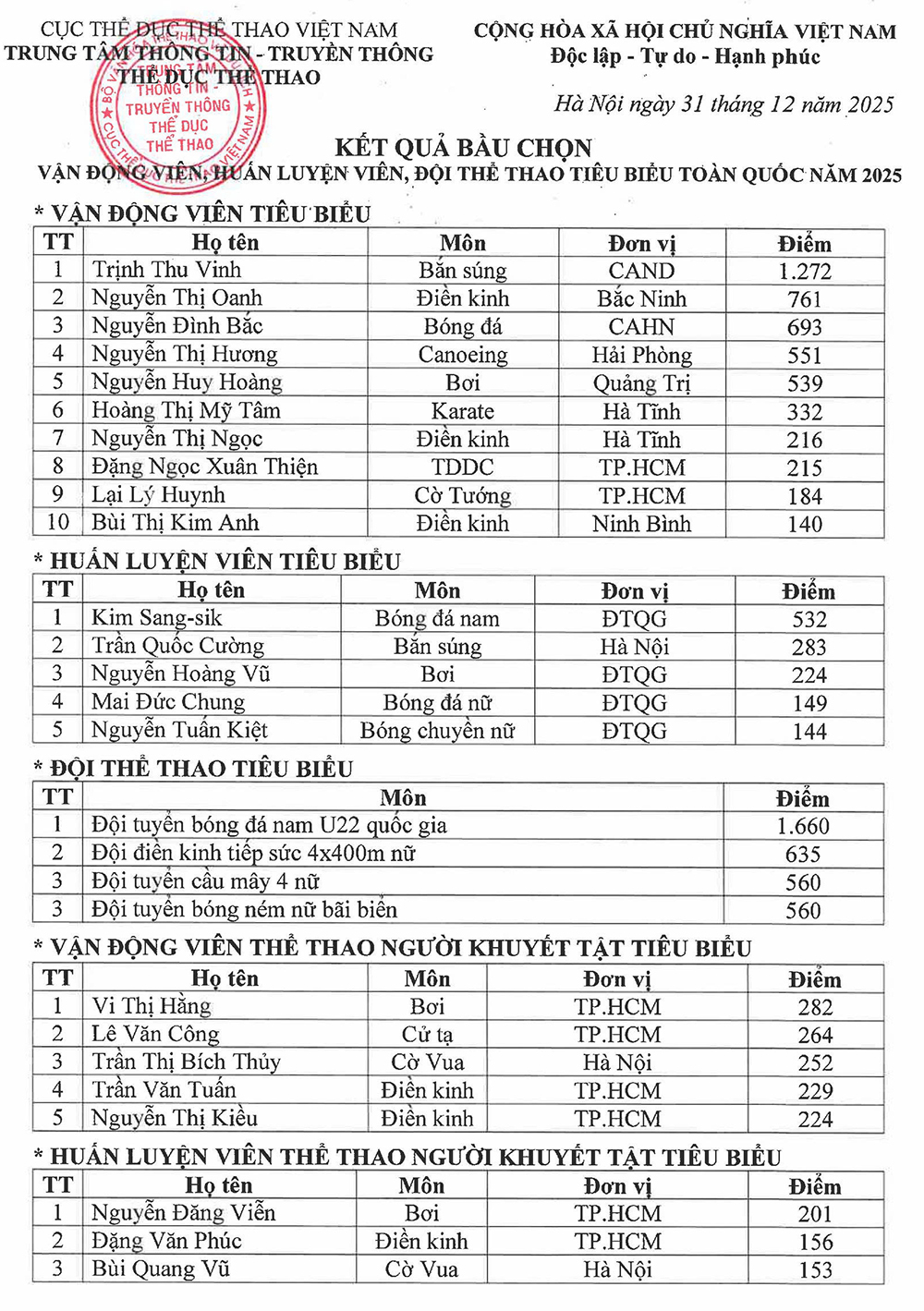 Những cá nhân và tập thể tiêu biểu này sẽ chính thức được vinh danh tại chương trình "Vinh quang Thể thao Việt Nam" dự kiến tổ chức vào ngày 27/3/2026. Đây là sự kiện đặc biệt chào mừng 80 năm ngày truyền thống ngành Thể dục Thể thao, nơi những giọt mồ hôi và nước mắt của các vận động viên sẽ được tri ân.
