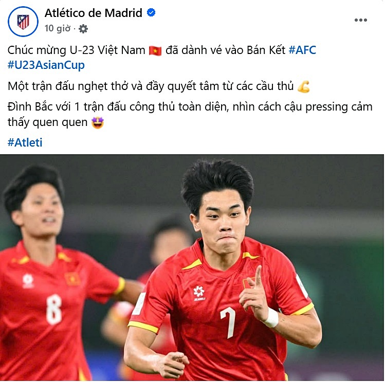 Đội bóng Tây Ban Nha, Atletico Madrid đã viết trên fanpage chính thức: "Chúc mừng U-23 Việt Nam