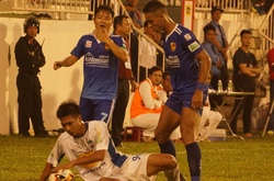 HLV Nguyễn Minh Phương (SHB Đà Nẵng) không hài lòng với quyết định thổi việt vị của tổ trọng tài trong tình huống Đỗ Merlo ghi bàn vào lưới FLC Thanh Hóa.
