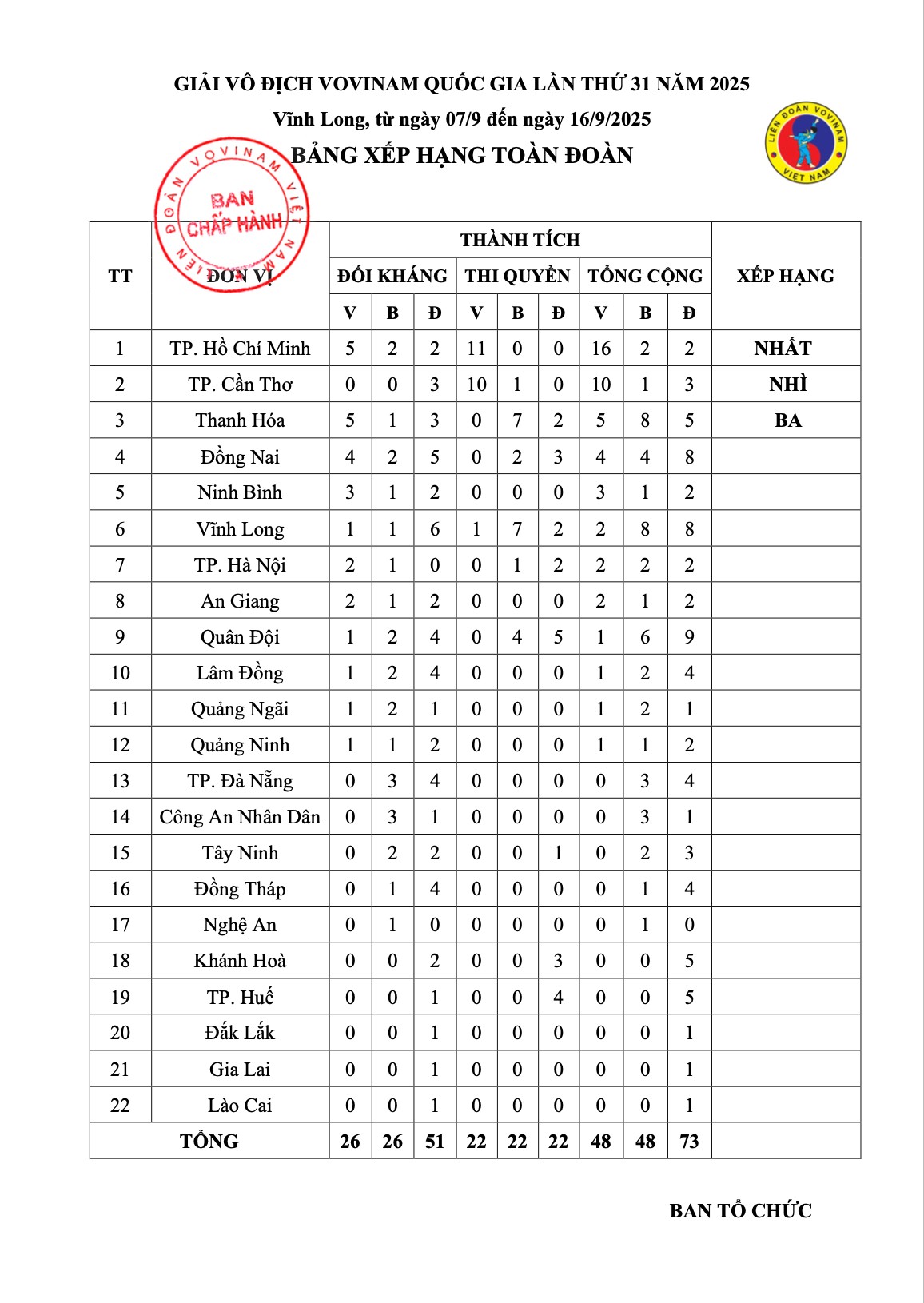 Sau 5 ngày tranh tài, TP.HCM tiếp tục khẳng định là địa phương phát triển phong trào Vovinam mạnh mẽ nhất cả nước khi giành 16 HCV, 2 HCB 2 HCĐ để bảo vệ thành công ngôi đầu toàn đoàn nhiều năm nay. Trong đó thế mạnh nội dung quyền vẫn được duy trì với 11 HCV, còn các hạng cân đối kháng có sự tiến bộ khi giành 6 HCV, 2 HCB, 2 HCĐ.